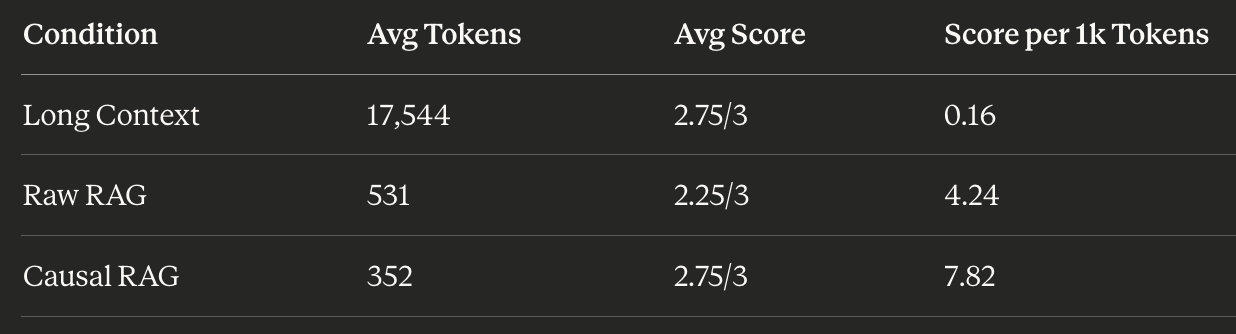 I had another LLM call judge the question responses. As expected, the Causal RAG approach performed just as well as the Long Context approach, but used only 2% of the input tokens to get there.
