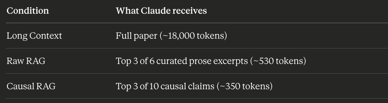 For each, I sent it to the Claude API, with 1 of 3 supporting artifacts; the entire research paper (Long Context), 6 raw chunks from the paper that represent the core ideas (RAG style), or 10 causal relationships from the DAG above (Causal RAG).